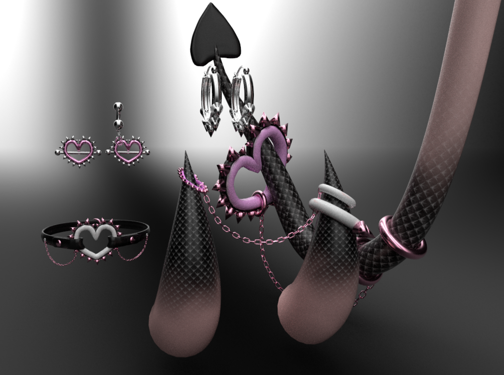 This set contains; Horns, Tail, Earrings, Nipple piercings, Belly piercing, Collar/Garter
